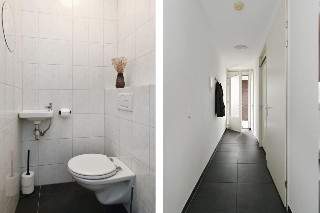 Op de eerste verdieping is de toegang naar het appartement. Je komt binnen in een prettige gang met meterkast en toegang naar de toiletruimte. Deze is netjes ingericht met vrijhangend closet en fonteintje.