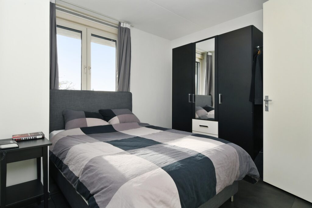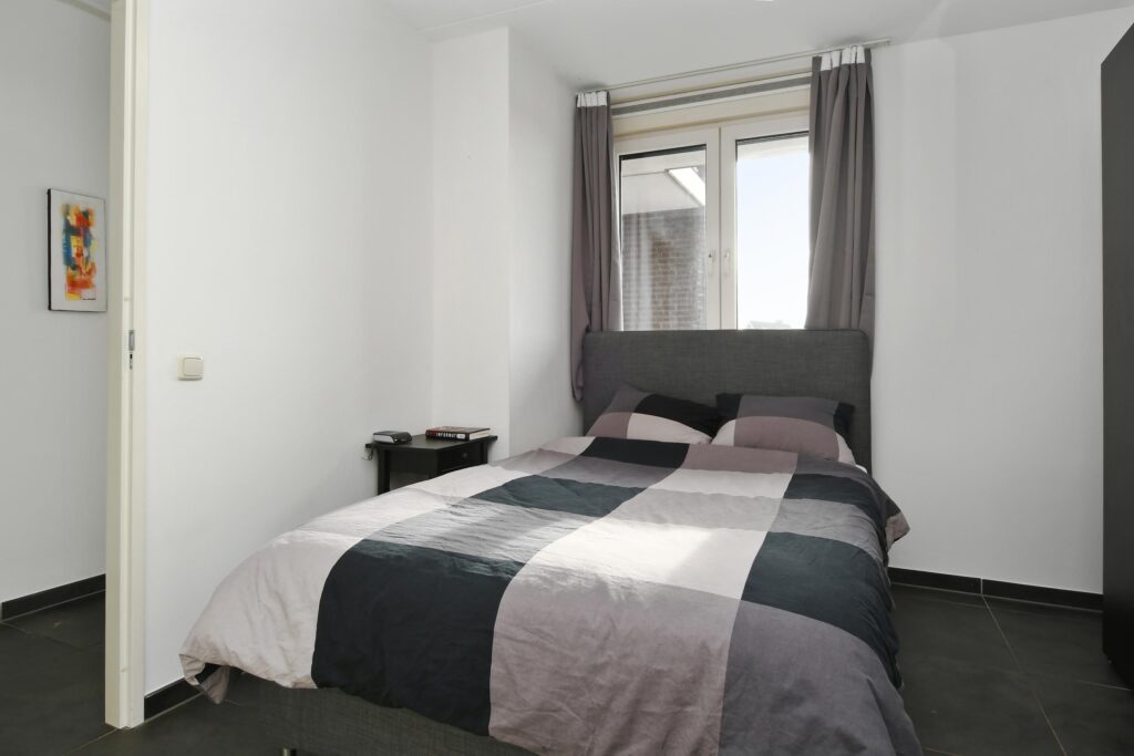 De slaapkamer ligt aan de rustige achterzijde. Vanuit de slaapkamer loop je direct de badkamer in met inloopdouche, wastafel en aansluitingen voor wasmachine en droger.