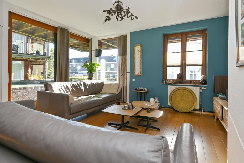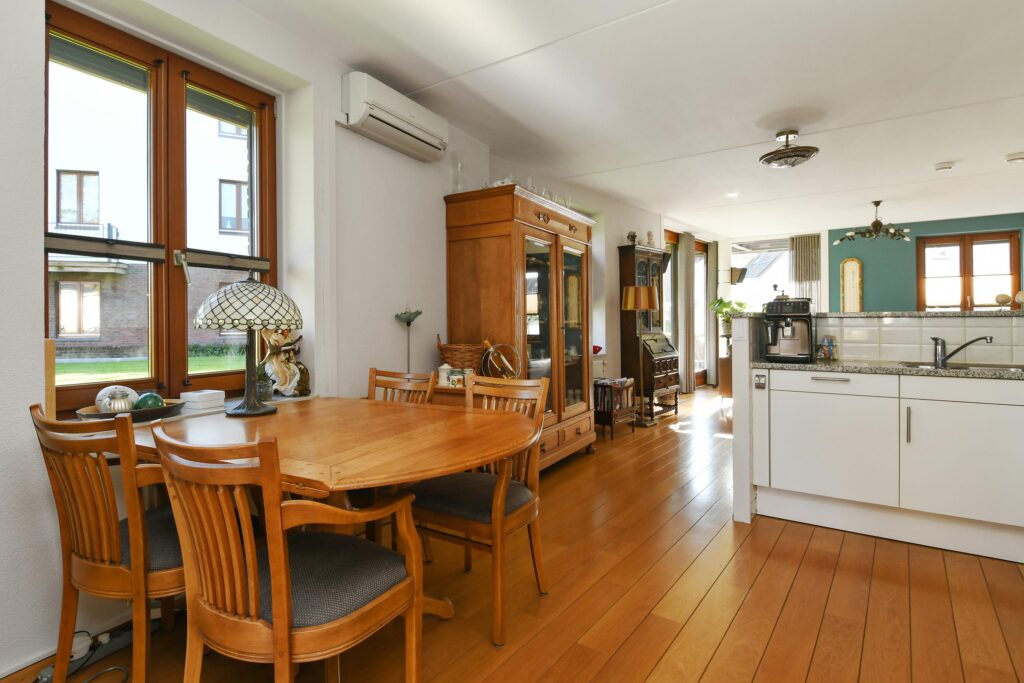 De ruime woonkamer heeft veel daglichttoetreding en een schuifpui naar het terras aan de voorzijde en een schuifpui aan de achterzijde naar het terras met een prachtig uitzicht over de Binnenwiek richting het kanaal en Molenakker aan de achterzijde.
