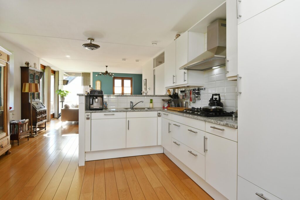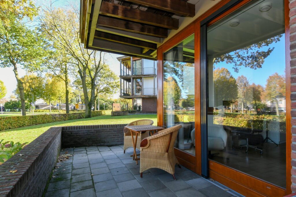 Door de ligging van de leefruimte over de gehele diepte van het appartement hebben de woonkamer en keuken overal een heerlijk tuincontact en vrij uitzicht.