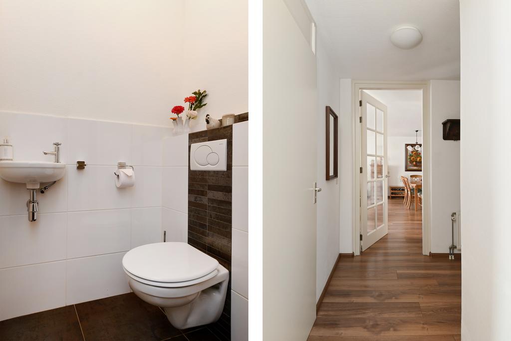 De toiletruimte is mooi en luxe betegeld ingericht met een closet en fonteintje.