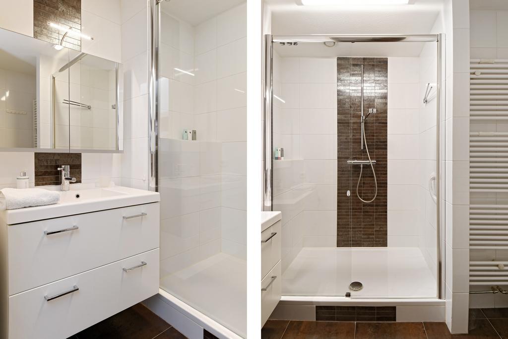 De badkamer is luxe betegeld en modern ingericht met ruime douche en lage instap, designradiator en badkamermeubel met ingebouwde wastafel.