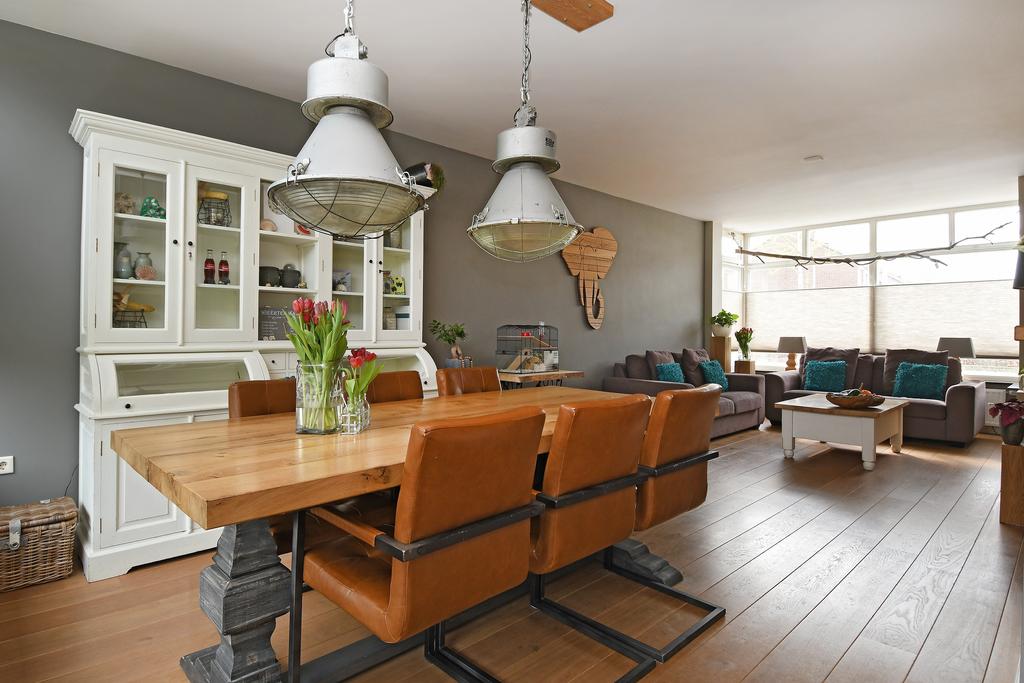 De woonkamer en keuken hebben een mooie parketvloer met een warme uitstraling.
