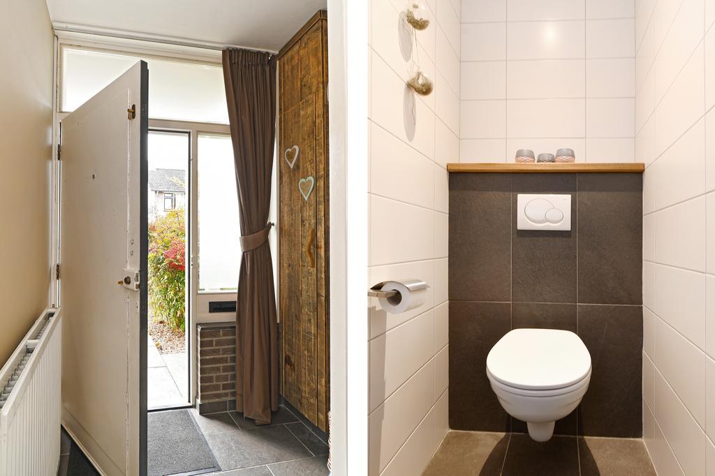 Mooie overdekte entree naar de woning. Hal met meterkast met moderne groepenkast. De toiletruimte is geheel betegeld en heeft een vrijhangend closet.
