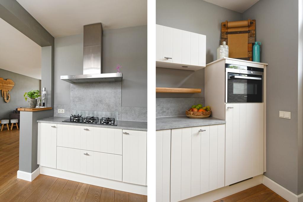 De keuken heeft een moderne landelijke stijl en is ingericht met een 5-pits-gaskookplaat, afzuigkap, koelkast, combi-oven/magnetron en afwasmachine.