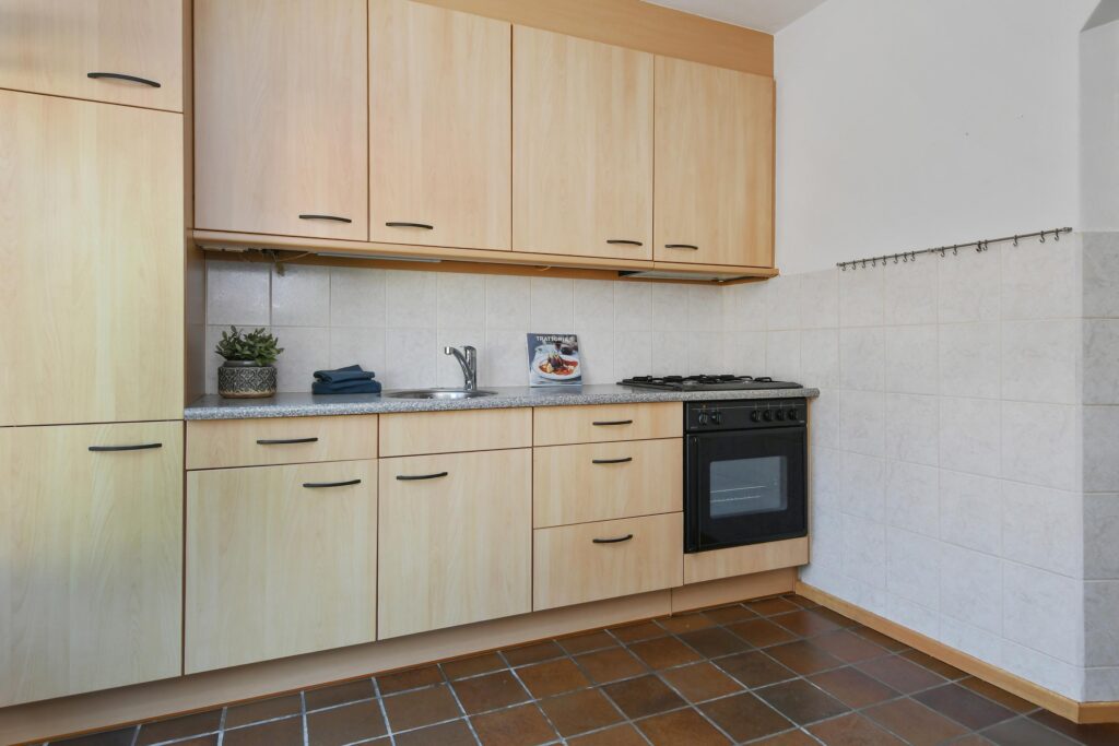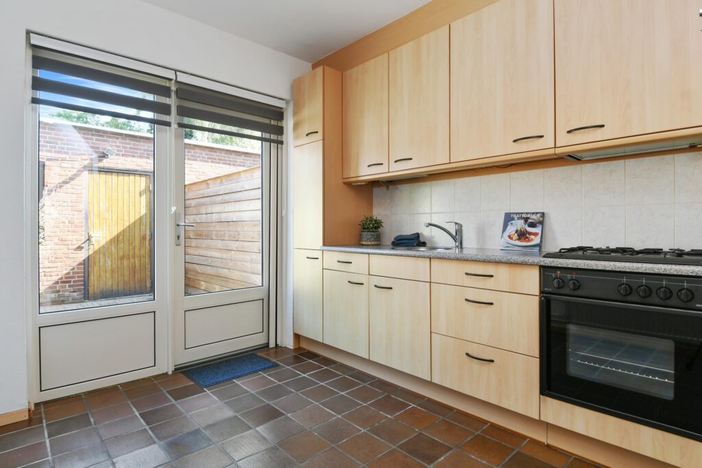 De aparte gelegen keuken is prima ingericht, heeft veel opbergruimte en er is plaats genoeg om een ontbijttafel te plaatsen. Er is een handige verdiepte trapkast voor extra bergruimte. Vanuit de keuken loop je via de tuindeur direct naar het terras en de tuin.