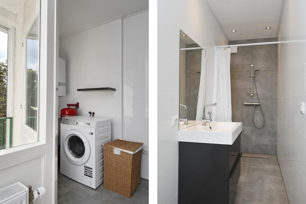 Aansluitend is de doucheruimte met mooie inloopdouche en badkamermeubel met ingebouwde wastafel.