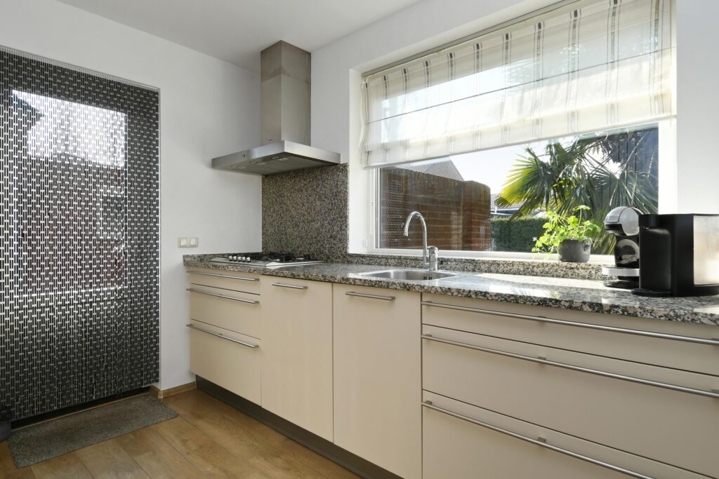 De keuken ligt apart en is zowel stijlvol als functioneel ingericht. Het granieten werkblad biedt een luxe uitstraling en volop werkruimte, terwijl de moderne inbouwapparatuur het koken comfortabel maakt. Een plek waar je met plezier je dag begint of afsluit.