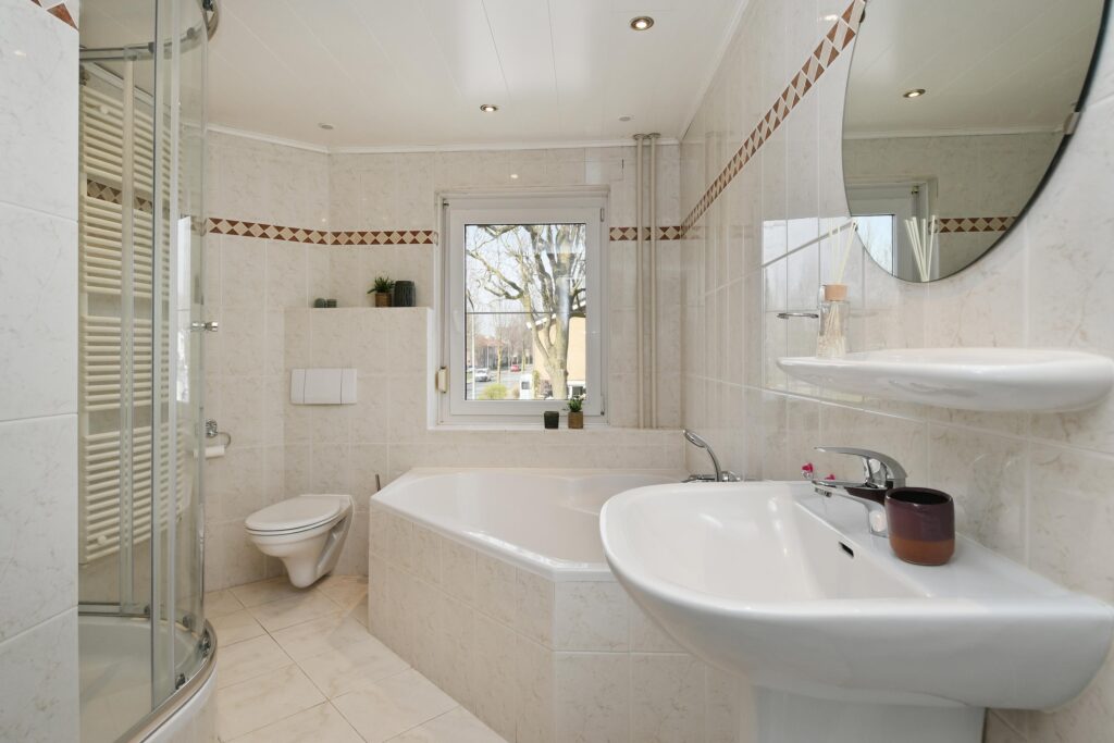 De badkamer is heel compleet ingeircht met een ligbad, douchecabine, vrijhangend toilet en wastafel – een plek waar je de dag rustig kunt beginnen of ontspannen kunt afsluiten.