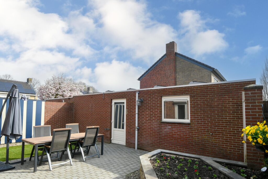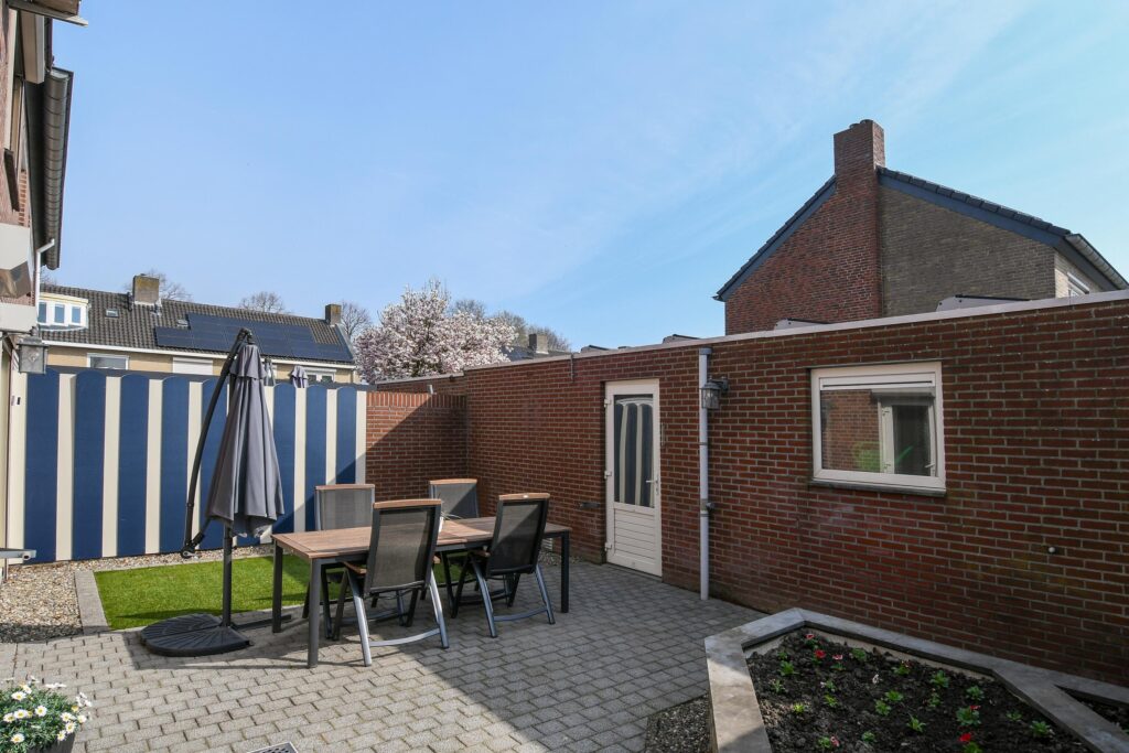 De achtertuin is onderhoudsvriendelijk aangelegd met een terras, kunstgras en een sfeervolle border – een plek waar je eenvoudig een fijne buitenruimte creëert, zonder veel onderhoud.