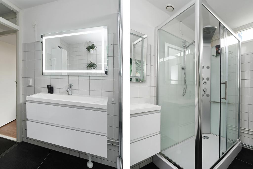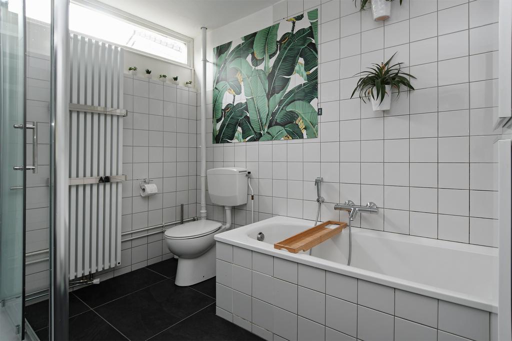 De badkamer heeft een goede maatvoering en is daardoor ingericht met zowel een ligbad als een moderne douchecabine. Ook is er een toilet, een designradiator en een badkamermeubel met ingebouwde wastafel.