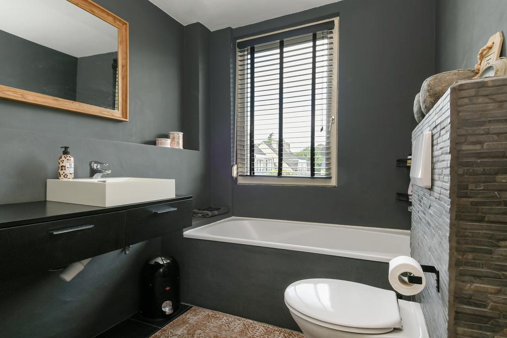 De badkamer is ingericht met een ligbad, badkamermeubel met wastafel en een vrijhangend closet.