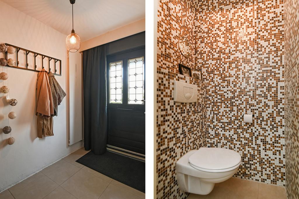 Hal met meterkast (moderne groepenkast) en toiletruimte met vrijhangend closet en leuk mozaïek- tegelwerk.