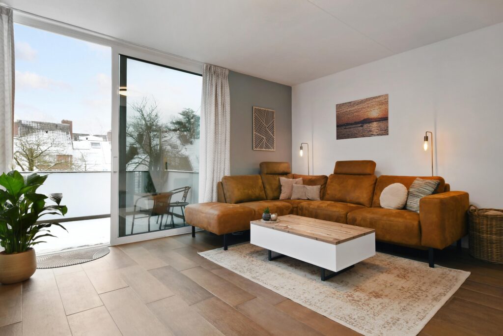 De woonkamer beschikt over een brede schuifpui naar het dakterras aan de voorzijde, een heerlijke plek om ’s ochtends van de zon te genieten of op warme dagen juist de schaduw op te zoeken.