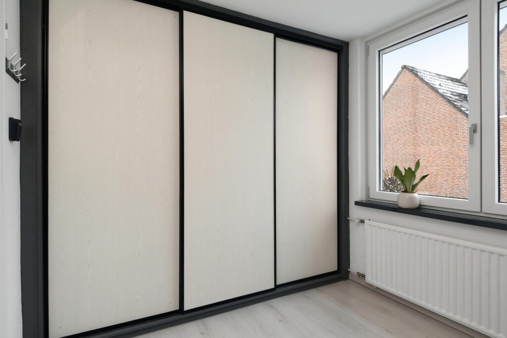 De hoofdslaapkamer heeft een ideale vaste kastenwand en ligt rustig aan de achterzijde van de woning.