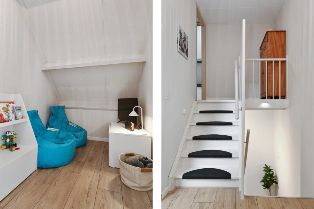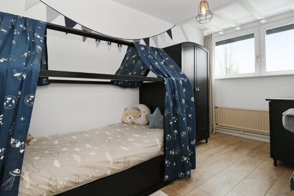 De ruime overloop is perfect te gebruiken als werk- of speelplek. De aangrenzende slaapkamer is royaal van formaat en dankzij het grote dakraam (met duo plissé-verduisteringsgordijn en hor) heerlijk licht.