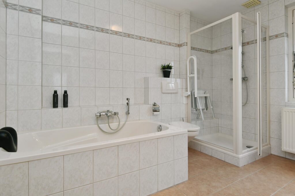 De badkamer is royaal van opzet en voorzien van een ligbad, separate douchecabine, vrijhangend toilet en een badkamermeubel met wastafel. Vanuit de badkamer is via een vaste trap de tweede verdieping bereikbaar.