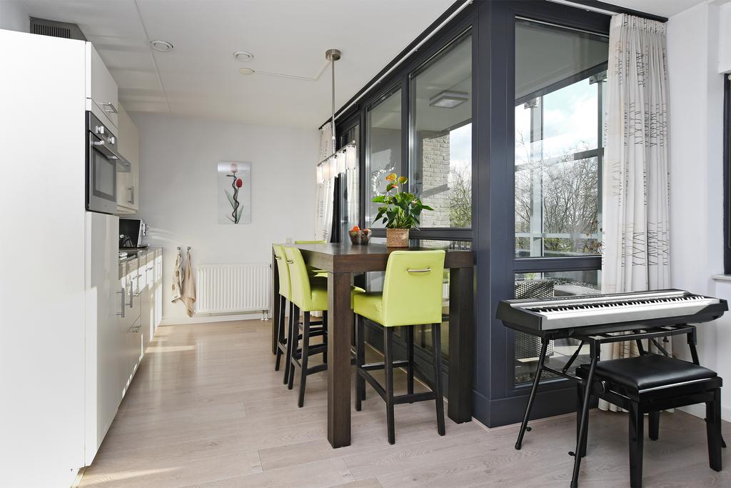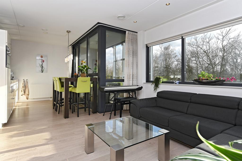 De living aan de voorzijde van het complex heeft een fijn rustig uitzicht naar de bomenrijen richting het zuiden. De living heeft een zitgedeelte en een moderne open keuken. Er is veel glasoppervlakte waardoor het appartement altijd lekker veel daglicht heeft.
