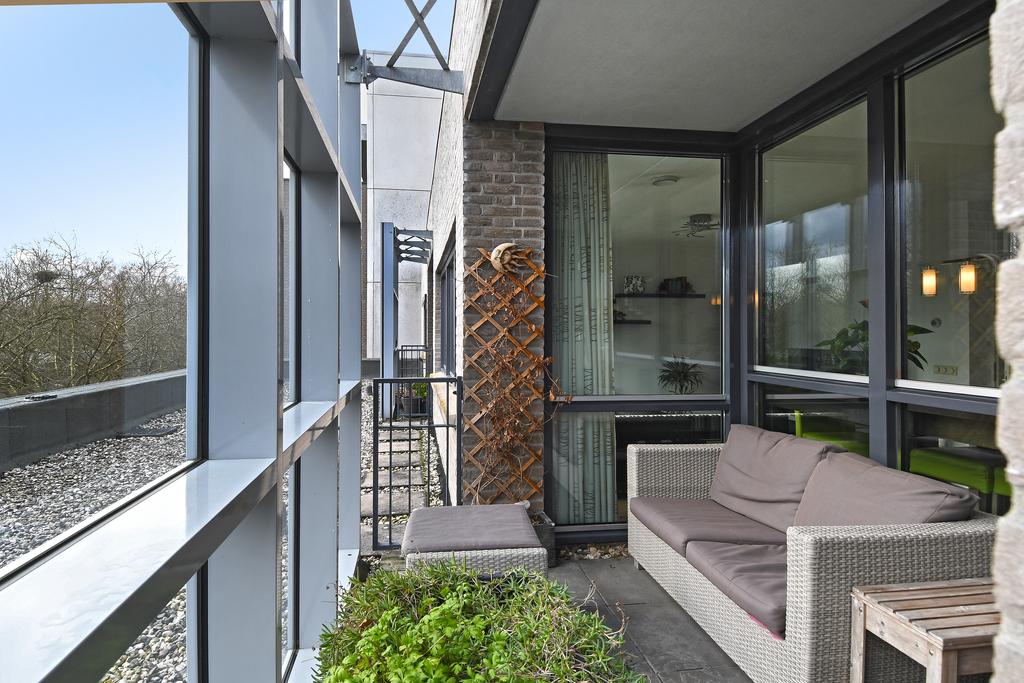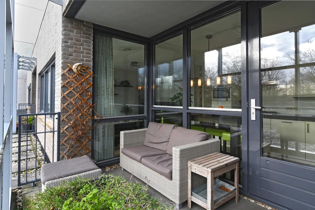 De loggia is gedeeltelijk inpandig waardoor je overdekt en lekker beschut kan genieten hier. De vrijstaande open glazen constructie voor de loggia geeft ook een prettige beleving en een windvrije buitenplek!