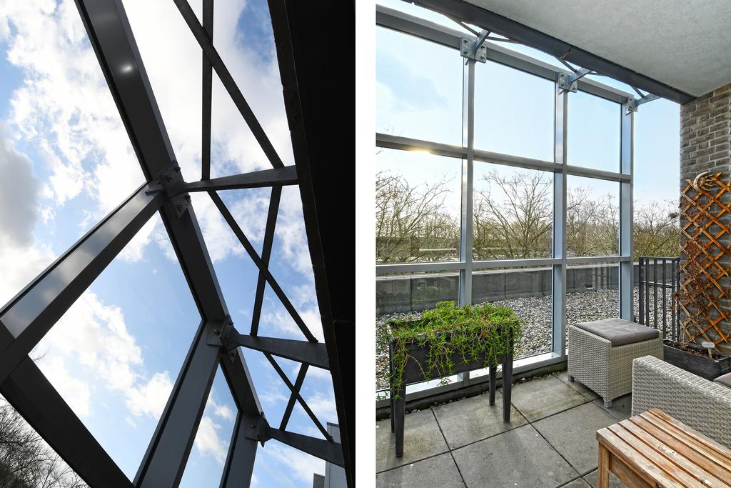 The loggia is partly indoor so you can enjoy covered and sheltered here. The freestanding open glass construction in front of the loggia also provides a pleasant experience and a wind-free outdoor area!