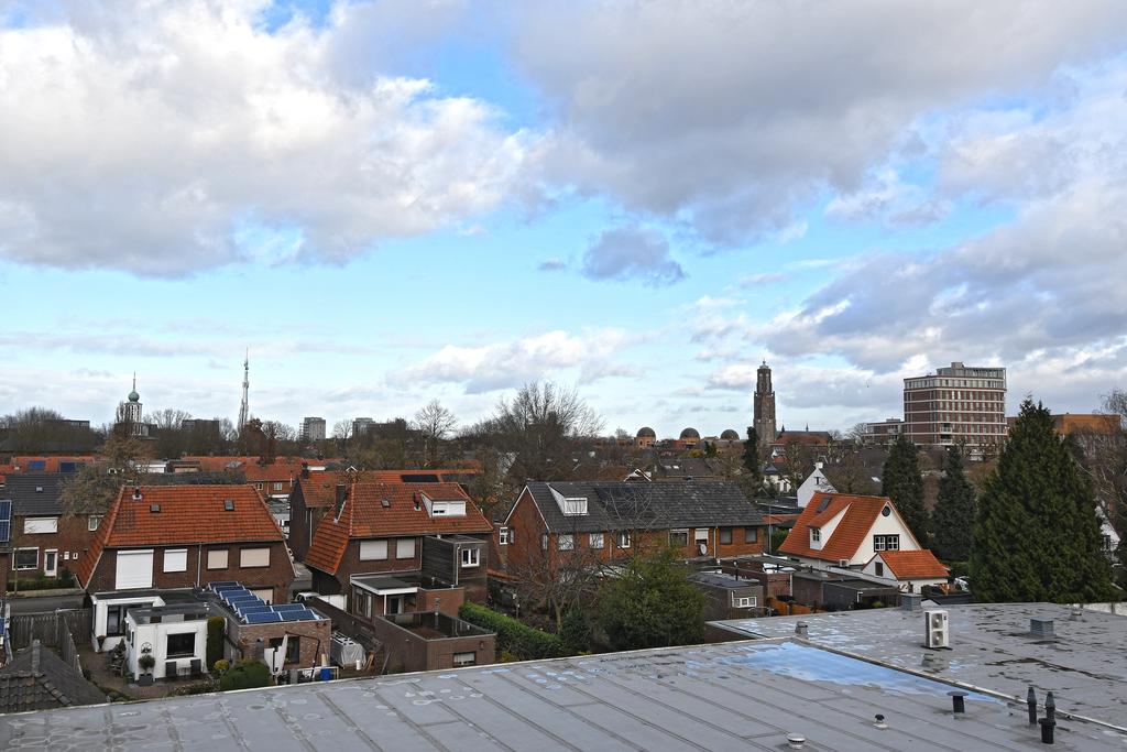 Op de vierde woonlaag ga je via de half-open galerij met mooi uitzicht over het stadscentrum naar de entree van het appartement.