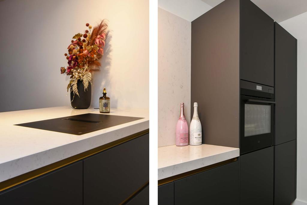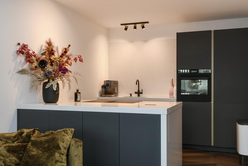 De open keuken is geheel vernieuwd en modern ingericht met kookeiland en keukenwand. Het kookeiland heeft een inductiekookplaat met ingebouwde afzuiging. De gootsteen heeft een ideale kokend-waterkraan en de afwasmachine, oven en koel-/vriescombinatie zijn ingebouwd. De keuken heeft veel lades en mede door het kookeiland veel werkruimte.