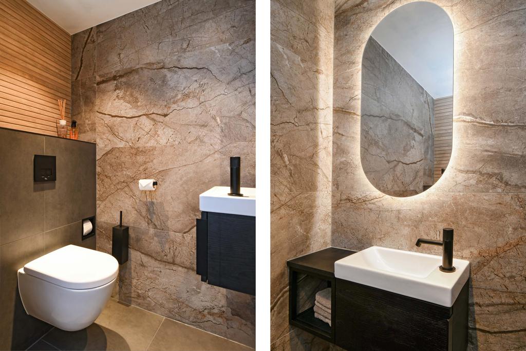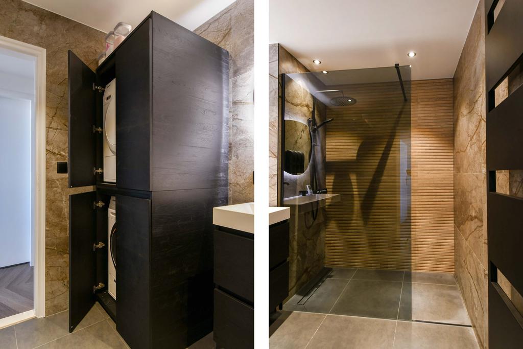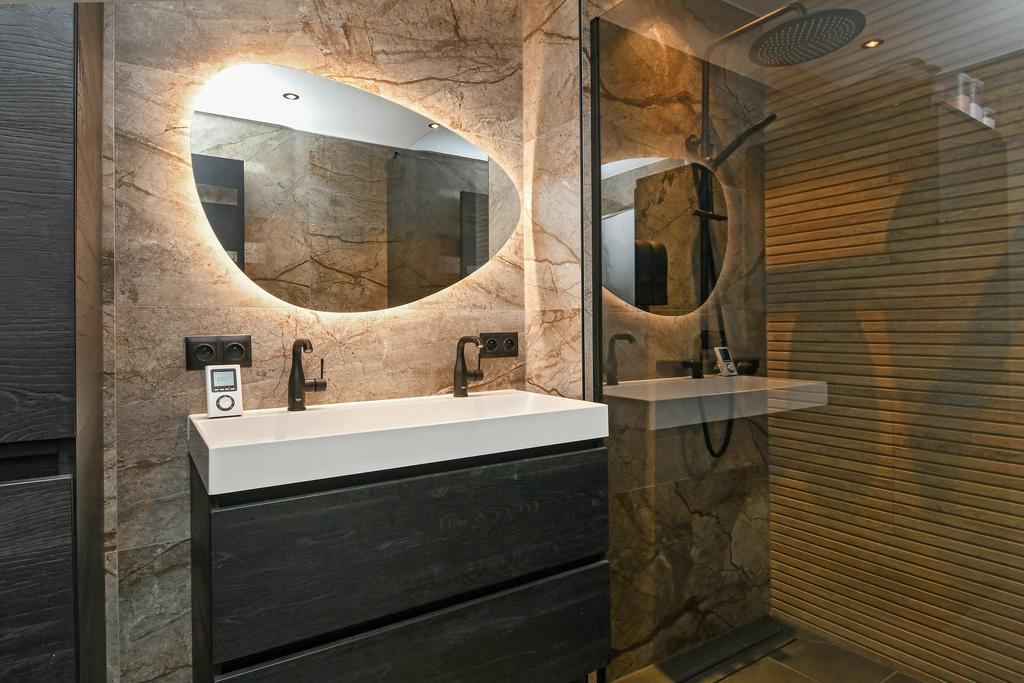 De badkamer is ook geheel gemoderniseerd en stijlvol en slim ingericht! Er is een inloopdouche en mooi badkamermeubel met ingebouwde wastafel met twee kranen.