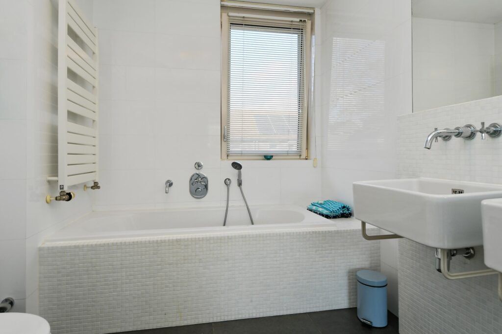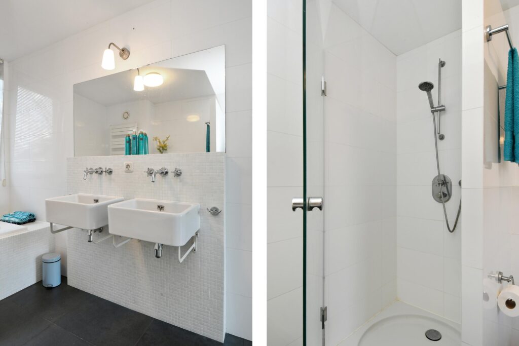 De ruime badkamer is heel compleet ingericht met een ligbad, een inloopdouche, vrijhangend toilet en dubbele wastafel – ideaal voor drukke ochtenden.