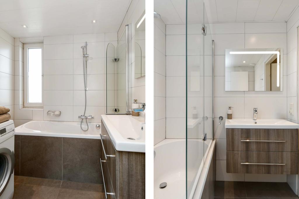 De badkamer is vernieuwd (ong. 2012) en praktisch ingericht met een ligbad en een badkamermeubel met ingebouwde wastafel.