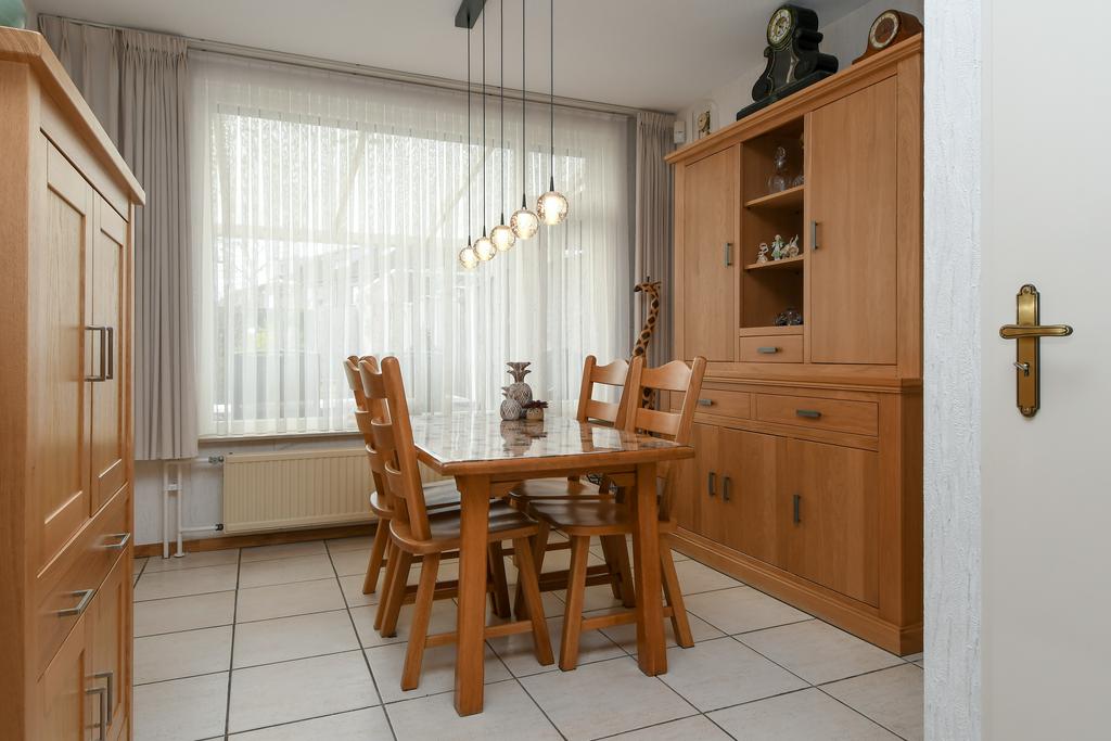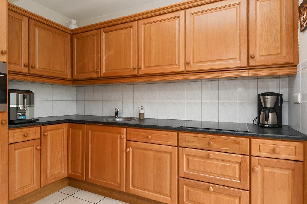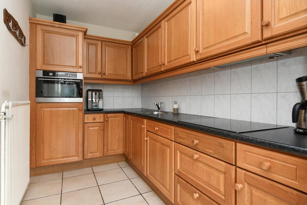 De keuken is apart van de woonkamer en deze is goed ingericht met een eikenhouten keuken in een moderne stijl. In de keuken zijn een keramische kookplaat, afzuigkap, combi-oven/magnetron en een koelkast ingebouwd.
