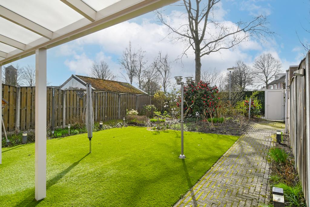 De achtertuin ligt heerlijk op het zuiden en is aangelegd met terras aan de woning, borders en een gazon. Er is een terrasoverkapping aan de woning aangebracht zodat je hier volop kan genieten van het uitzicht en jouw tuin en beschut.