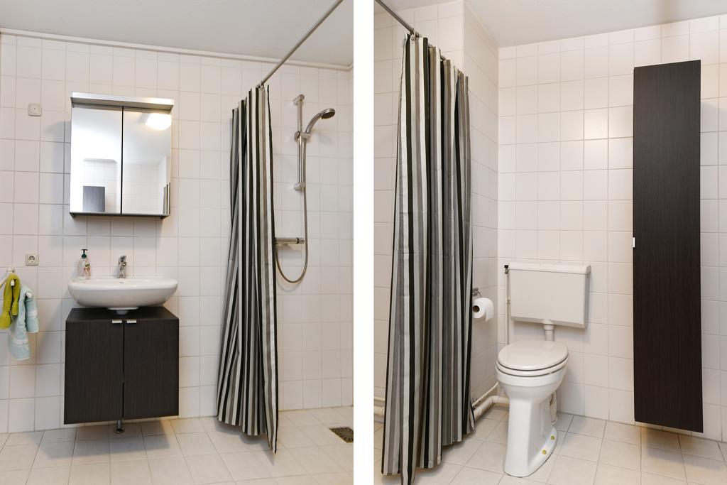 De badkamer is prima van maatvoering met een goede bewegingsruimte en is ingericht met een inloopdouche, badkamermeubel en wastafel met onderbouwkastje. De badkamer biedt ook de ruimte om de wasmachine en droger te plaatsen.
